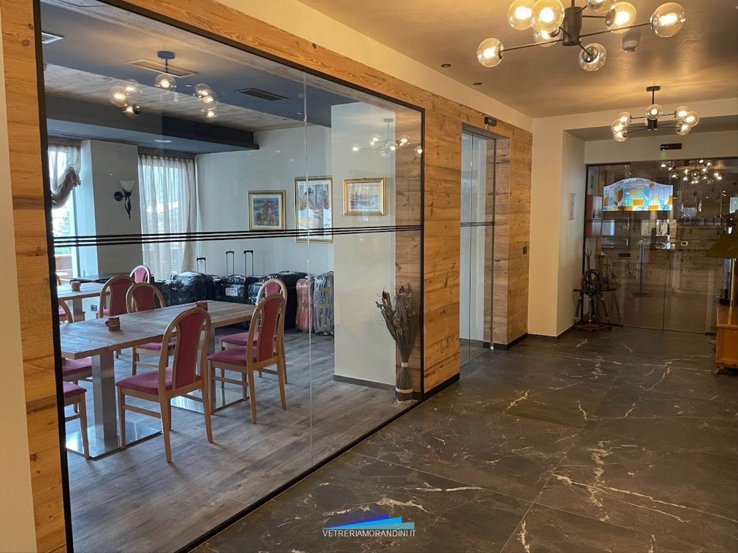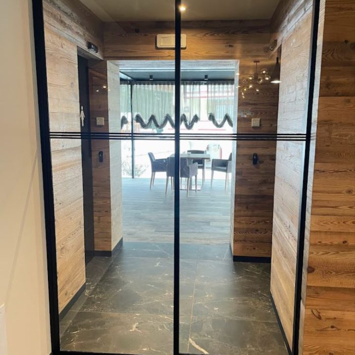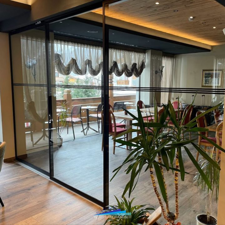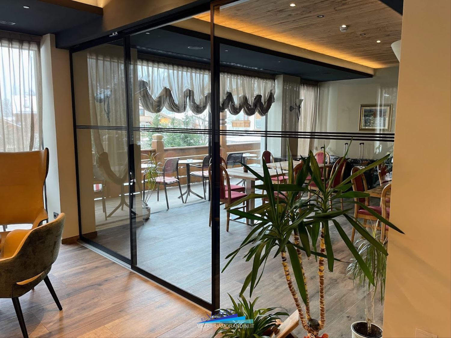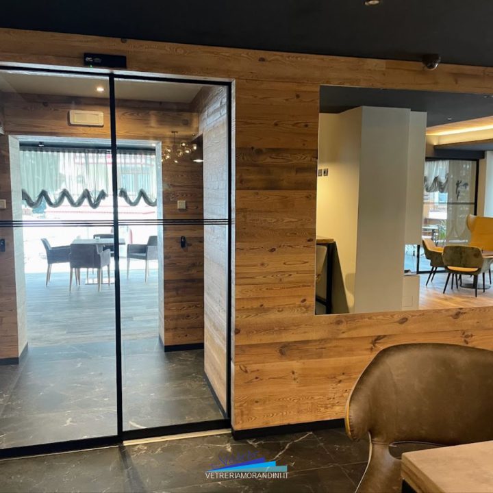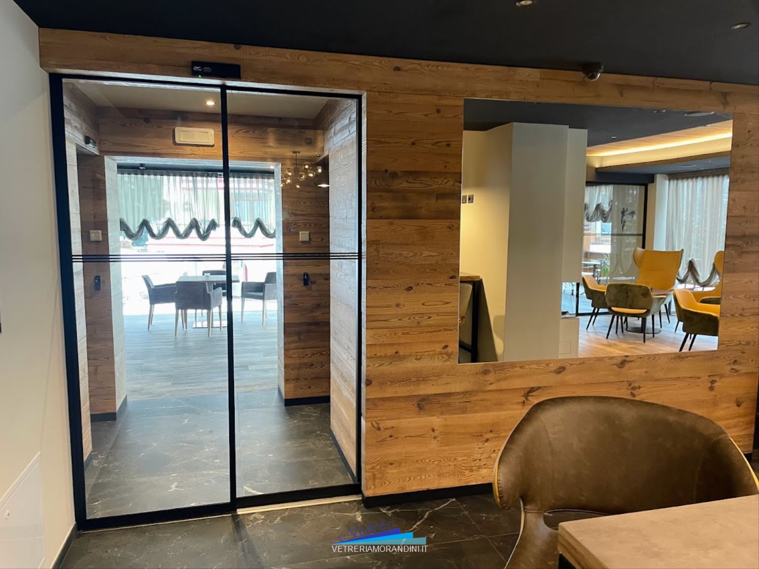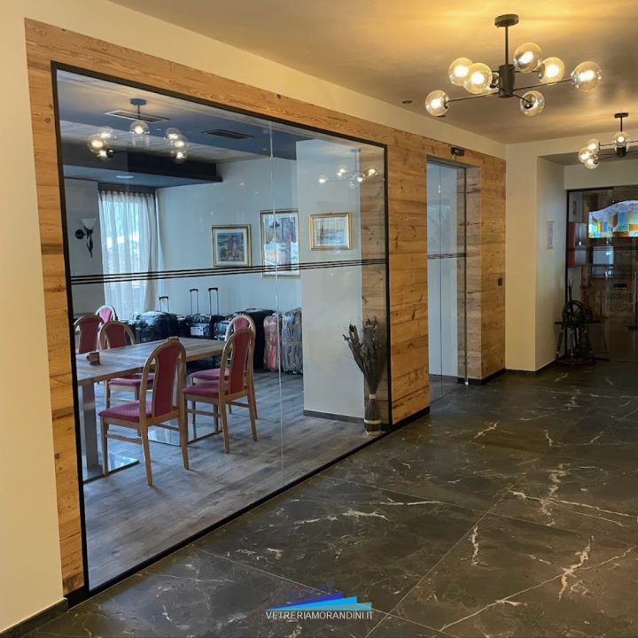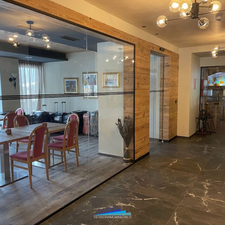 Grandi vetrate divisorie con ante in Cristallo Temperato per dare luce e profondità ai rinnovati spazi dell’Hotel Flora Alpina di Campitello di Fassa. Completano i nuovi arredi gli specchi panoramici e la vetrata con stampa digitale della coppia fondatrice di questo meraviglioso Hotel.