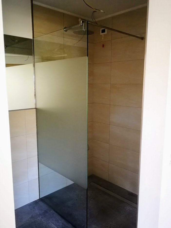 Il box doccia scelto è composto da una paretina fissa in cristallo da 10mm con una pellicola satinata con effetto privacy ad altezza corpo.