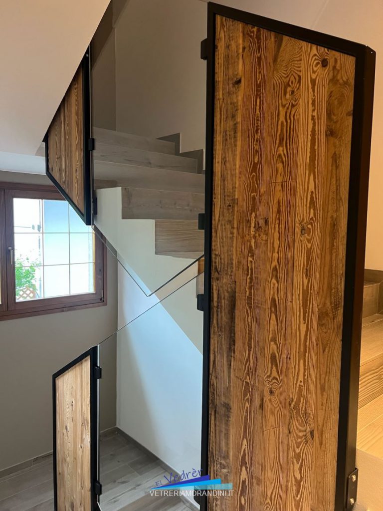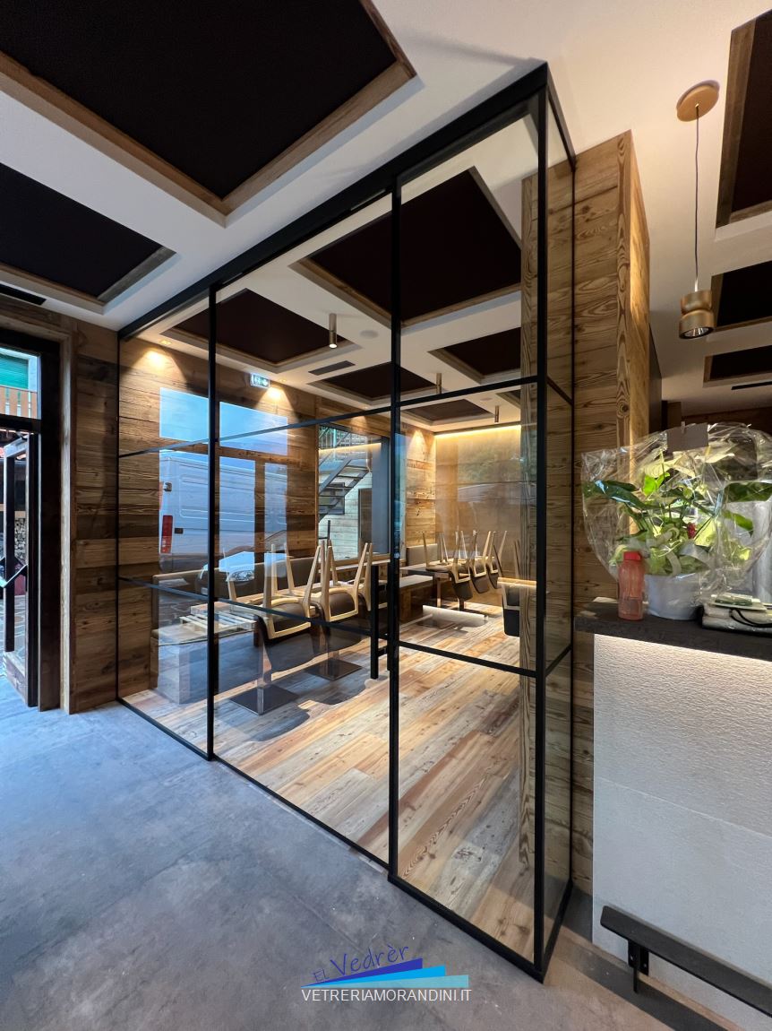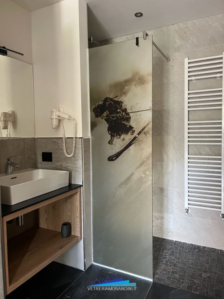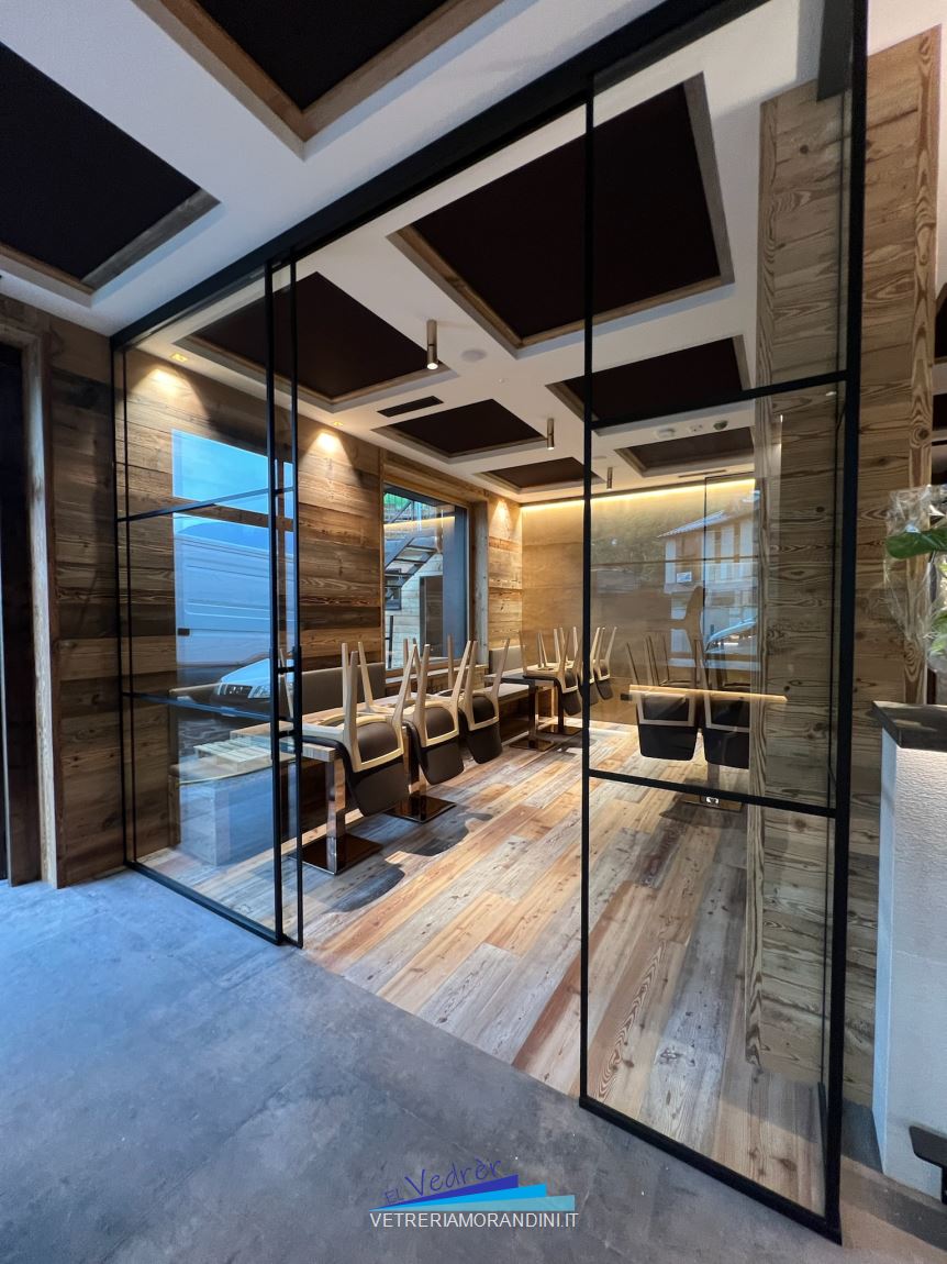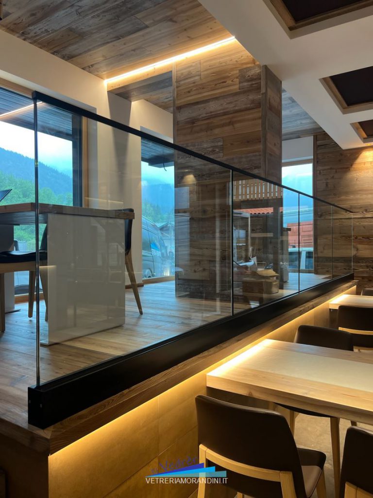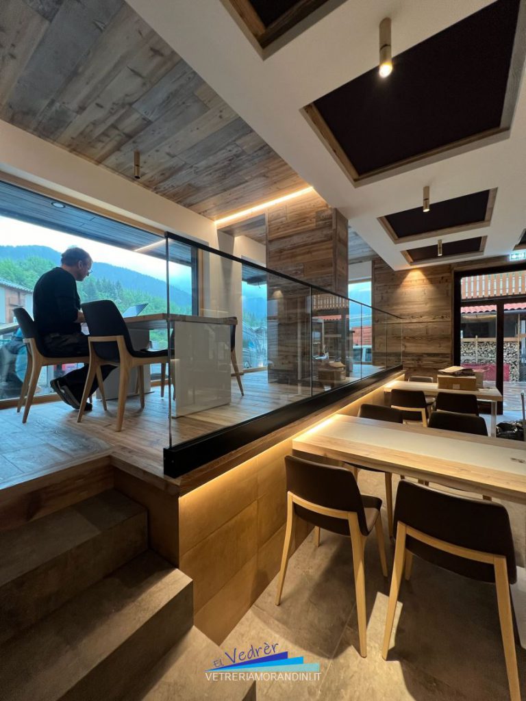La recente ristrutturazione dell’Hotel Promenade a Fiera di Primiero ha visto il vetro come elemento protagonista dei nuovi locali a piano terra creando ampi spazi trasparenti in stile moderno. Le decise linee nere sposano alla perfezione trasparenza e legno antico creando un ambiente dalla spiccata personalità. Anche la scala che sale ai piani viene rivista con inserti trasparenti che donano luce ed eleganza per raggiungere le stanze che vedono ancora il vetro nei box doccia e l’immancabile specchio retroilluminato a led con bordo nero.